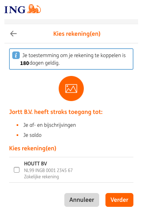 - Na het toestemming geven op de website van de ING word je weer teruggestuurd naar de bankkoppeling wizard op de website van Jortt.