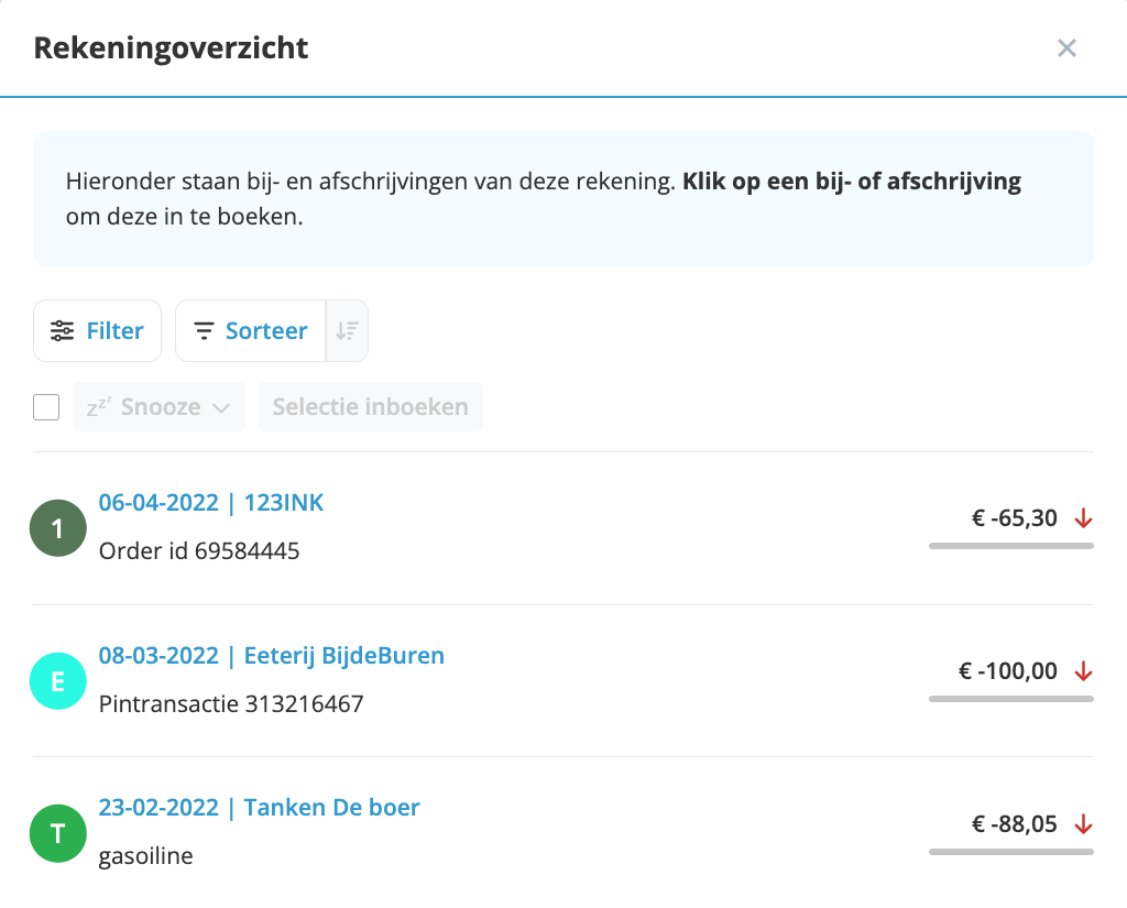- Klik op de Bij- of afschrijving die je wil inboeken. Er wordt een paneel geopend met de details van de banktransactie (rekeningnummer, rekeninghouder, bedrag, datum, omschrijving, e.d.).