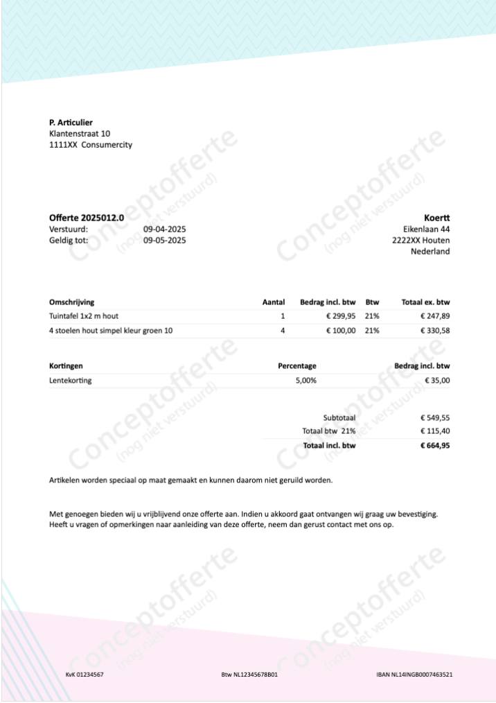 Eventuele opmerkingen over de offerte zoals extra uitleg, een promotie of het betalen van een voorschot bij acceptatie van de offerte voeg je hier toe. Je kunt opmerkingen boven of onder je offerteregels plaatsen.