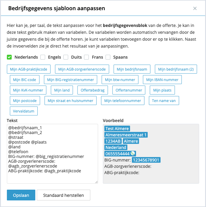 Per taal kun je de tekst en variabelen van je bedrijfsgegevens blok aanpassen: