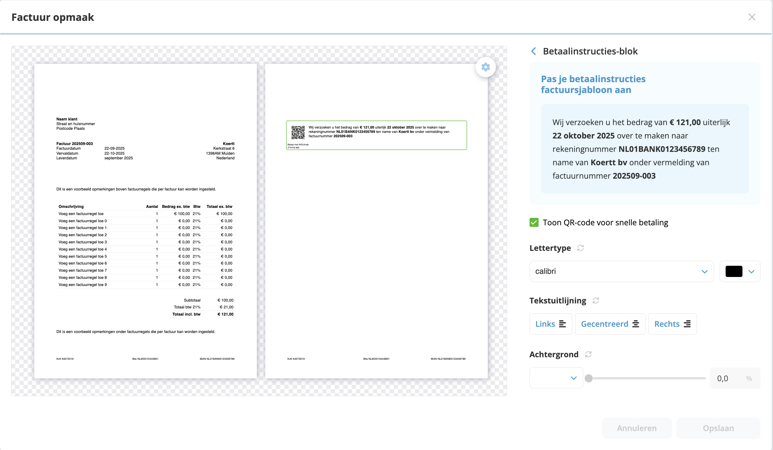 Facturen sturen: Opmaak van je factuur editor. Pas font, kleur en marges aan.