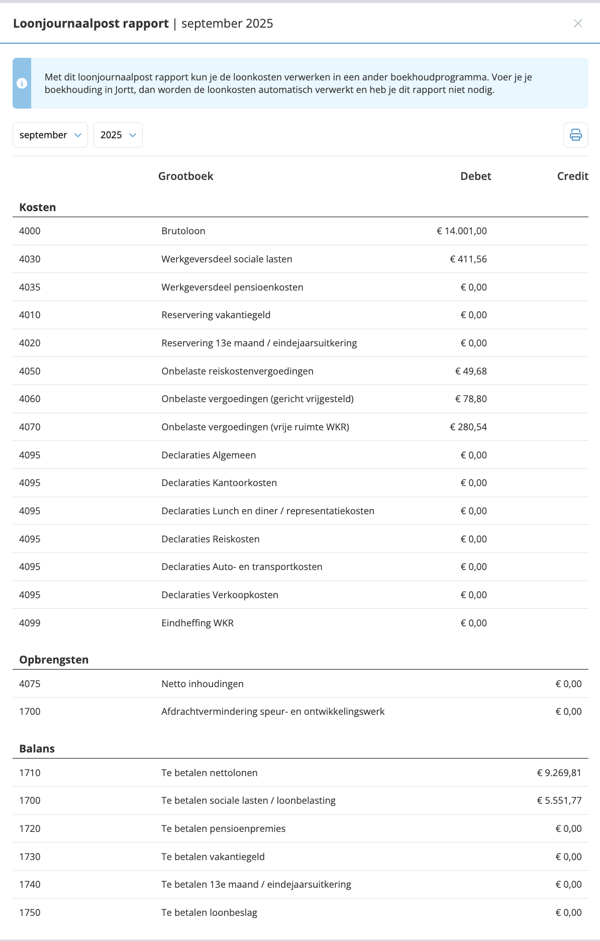 Salarisadministratie rapport: Loonjournaalpost rapport. Voor als je de lonen doet met jortt, maar de boekhouding in een ander programma.