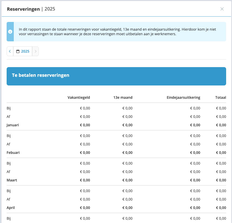 Salarisadministratie: Rapport voor de totale reserveringen voor vakantiegeld, 13e maand en eindejaarsuitkering (wereldprimeur 🌍🎉).